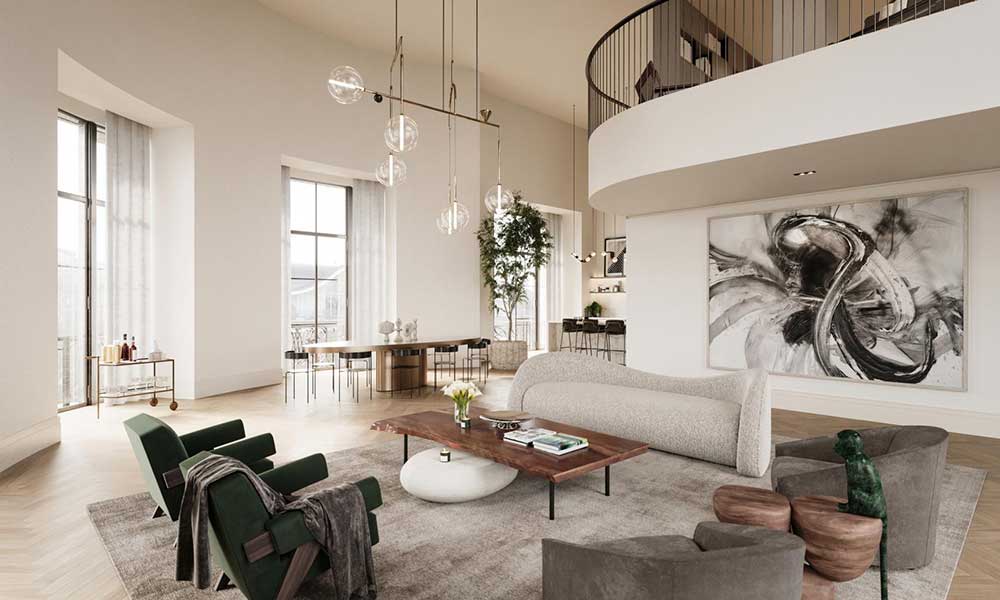 Complejo residencial que destaca por el uso de mármol y madera en su diseño interior.
