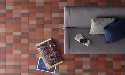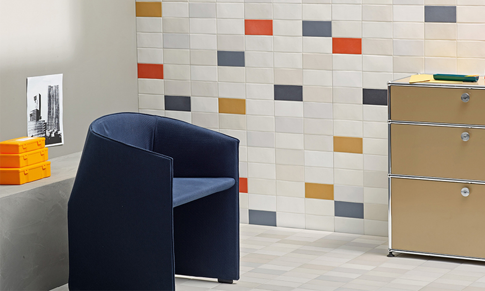 En lugar de crear losas de porcelana en un mismo color uniforme, Ed Barber y Jay Osgerby optaron por aplicar copos de porcelana de color con tonos en contraste al azar para crear un efecto irregular en la superficie de las baldosas, perceptible visualmente y al tacto.